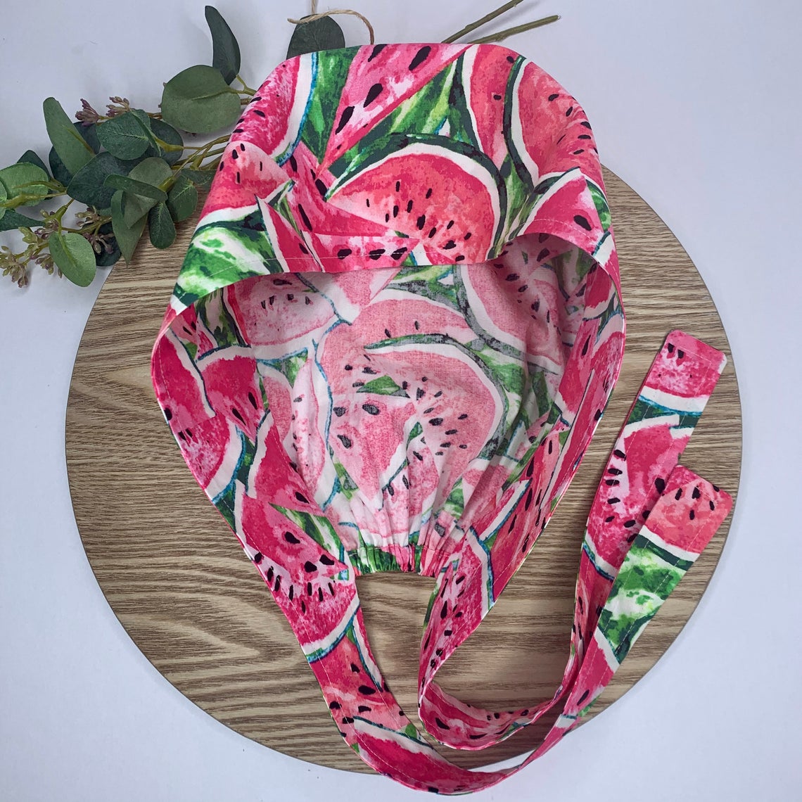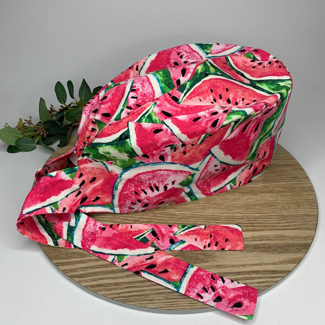 The scrub caps measures 60cm around and has long ties and elastic at the back for additional width so will fit most head sizes and women with long hair.