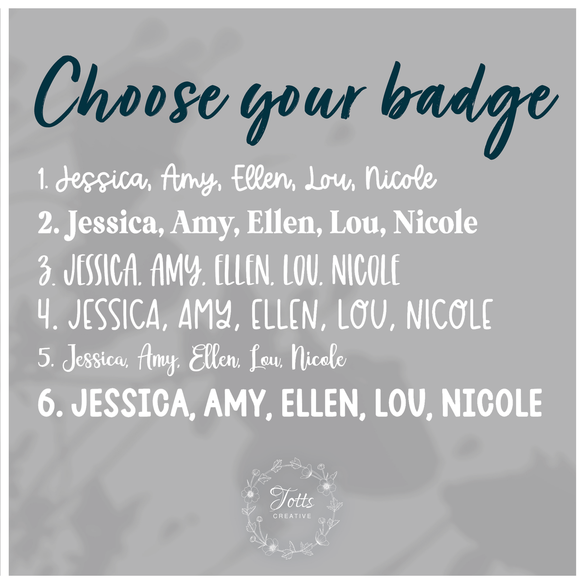 Badge sizes varies from 5cm to 5.6cm depending on name length.