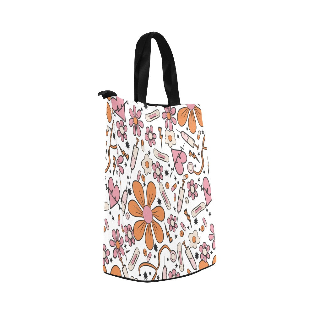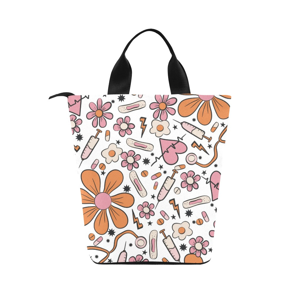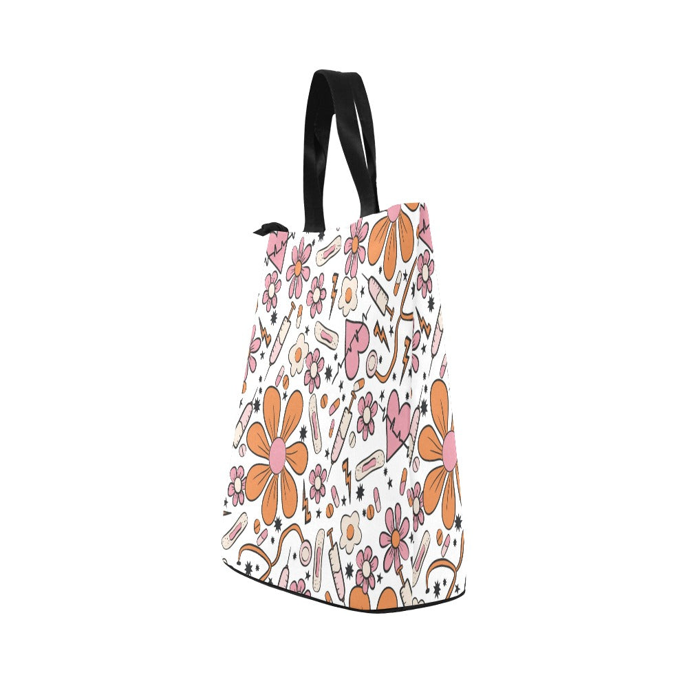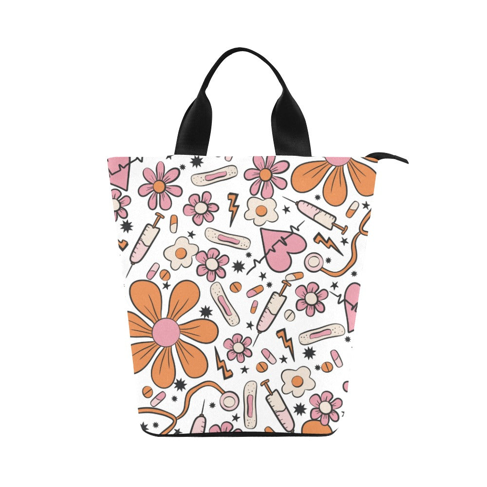 Material: Premium 1200D nylon with waterproof finish, featuring our signature retro white, pink, and orange nurse-inspired pattern. Sturdy black handles for comfort and style.