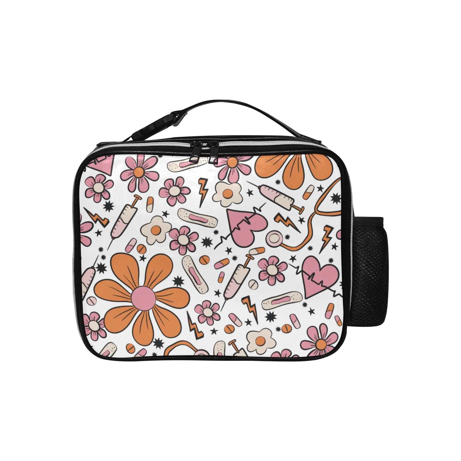 Material: High-quality PU leather with a glossy retro white, pink, and orange nurse-inspired pattern. Finished with sturdy black detailing for a sleek, professional look.